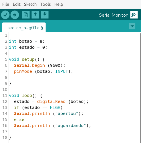 - na linha 13, usamos um if para verificar se o botão foi apertado. Neste caso, a leitura de digitalRead será HIGH e é o que aparecerá na variável estado.
