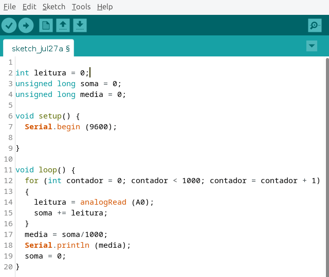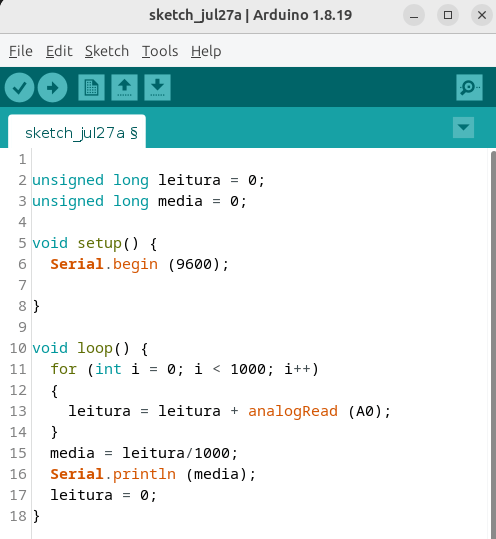 - nas linhas 2 e 3, criamos duas variáveis: uma para guardar as leituras do LDR e outra para guardar a média destas leituras.