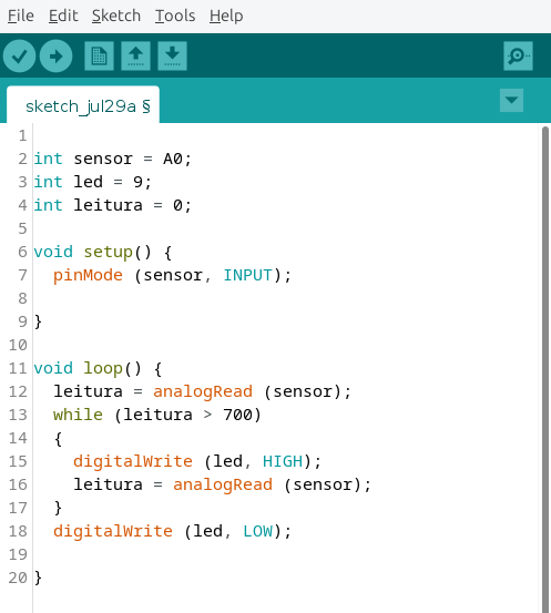 Depois que iniciamos o while, as linhas 15 e 16 serão as únicas executados pelo Arduino até que a linha 16 tenha um valor menor que 700 na variável leitura. Essa linha é fundamental. Sem ela, o loop nunca terminaria. Ou seja, quando usamos o while, devemos lembrar de colocar dentro dele algum comando de verificação, para saber quando o programa deve sair do mesmo.