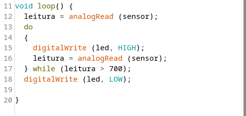 Veja que o comando do na linha 13 executará as linhas 15 e 16, antes de verificar a variável leitura, na linha 17. Se a condição na linha 17 for verdadeira (leitura > 700), então as linhas 15 e 16 serão executadas novamente.