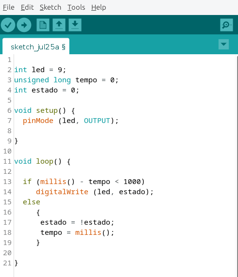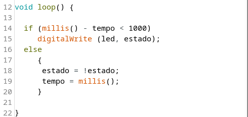 Uma segunda instrução é necessária: na linha 19, o valor que estava guardado na variável tempo é trocada pelo valor mais atual da função millis(). Isto faz com que a subtração volte para o zero e a linha 15 volte a ser executada, só que agora com um novo estado para o LED.
