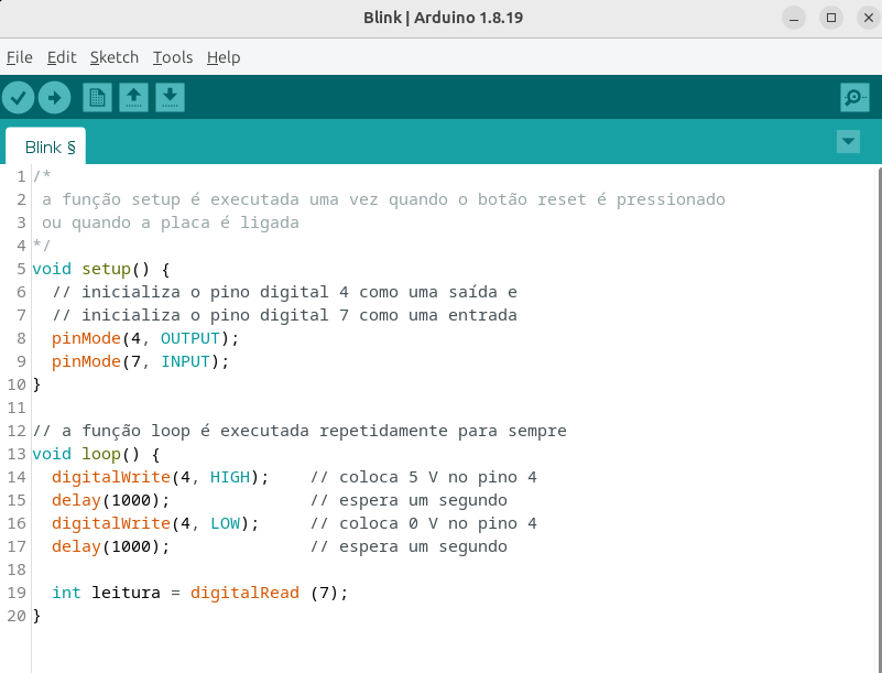 Aqui, nas linhas 8 e 9 do programa, estamos dizendo para o Arduino que usaremos os pinos 4 e 7. O pino 4 será usado como uma saída (OUTPUT) e o pino 7 será usado como uma entrada (INPUT).