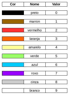 No código de cores, cada cor representa um número ou quantidade de zeros, seguindo a tabela a seguir: